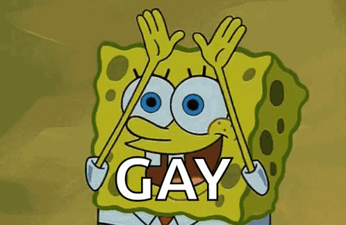 Spongebob Squarepants with a rainbow, hands up, and the word 'Gay' displayed. A popular LGBT pride meme.