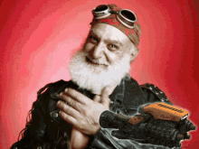 A smiling space biker, resembling a character from Star Atlas, proudly displays a Fimbul engine.