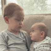 A toddler and a baby sit on a couch, engaging in a cute staring contest and interaction.