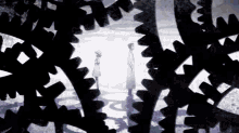A montage of characters from the anime Steins;Gate, set against a backdrop of moving gears.