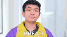 Steven He in a purple jacket with 'BREAD' written on it, looking at the camera.