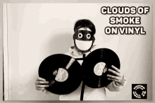 A person wearing a mask holds two vinyl records with "Clouds Of Smoke On Vinyl" text displayed.