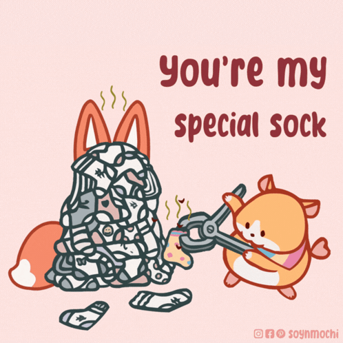 A cute hamster carefully handles a stinky sock for a fox, with the heartwarming message 'you're my special sock'.