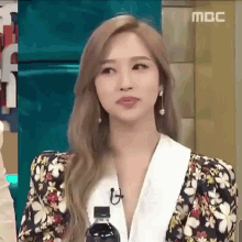 Straychae (Mina from TWICE) looks confused, holding a drink on an MBC broadcast.