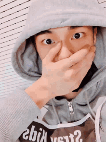Stray Kids member Hyunjin covers his mouth in a surprised or shocked reaction, looking directly at the camera.
