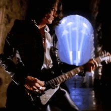 Joe Perry, wearing a black jacket, passionately plays an electric guitar in a dimly lit, atmospheric setting.