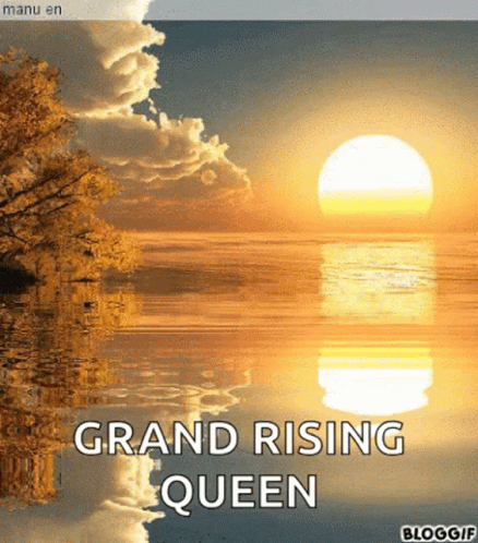 A stunning sunrise over water with a tree, featuring the text 'Grand Rising Queen'.