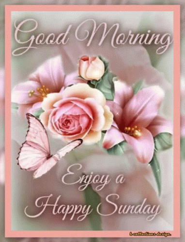 A beautiful greeting card with pink flowers and a butterfly wishing 'Good Morning' and 'Enjoy a Happy Sunday'.