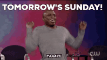 A man on stage excitedly exclaims 'Tomorrow's Sunday! Yaaay!!' with his arms raised in celebration.