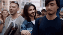 A humorous face swap featuring Kendall Jenner with a beard and sunglasses, created with the Reface App, walking in a crowd.