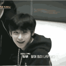 Sunoo from Iland smiles mischievously while watching something, with Korean captions.