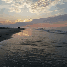 A serene beach scene at sunrise or sunset with gentle waves and a colorful sky, as people walk along the shore.