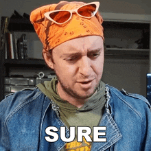 Peter Deligdisch, wearing a bandana and sunglasses, expresses 'Sure' with a thoughtful look.