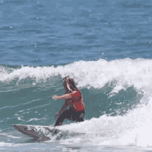 Pro surfer Caroline Marks carves a wave in the ocean, showcasing her skill and power in a red shirt.