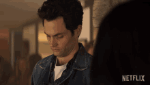 Penn Badgley as Joe Goldberg shows a surprised and shocked reaction in a denim jacket.