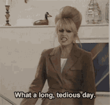 Susie, dressed in a suit, expresses her exhaustion after 'What a long, tedious day'.