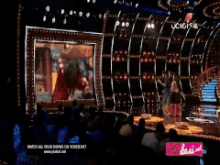 Swami Om performs an energetic dance in a red outfit on the Bigg Boss stage, entertaining the audience.