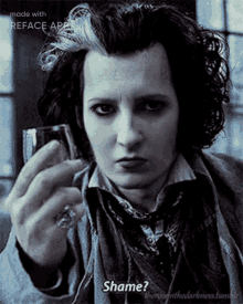 Johnny Depp as Sweeney Todd, holding a glass and asking 'Shame?' with a piercing gaze.