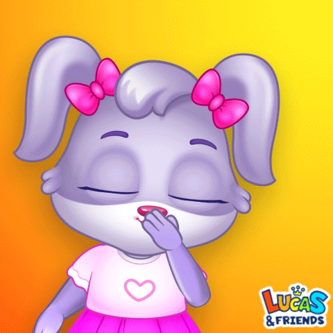 A cute purple cartoon bunny from Lucas & Friends blows a sweet flying kiss, wearing a pink outfit.