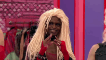 Symone, the Drag Queen, smiles and makes an iconic finger gesture, wearing blonde dreadlocks and red gloves.