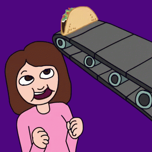 A cartoon woman eagerly awaits tacos moving towards her on a conveyor belt, ready to eat.