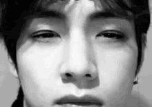 A close-up of Taehyung's face as his eyes slowly close and then open.