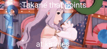 Takane Shijou from The Idolmaster points, with the caption "Takane that points at kinnies" overlaid.