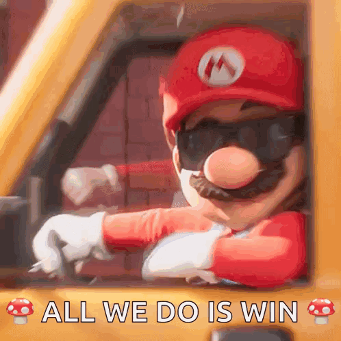 Mario and Luigi in a yellow car, with Mario taking off his sunglasses, displaying the caption 'ALL WE DO IS WIN'.