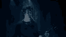 Tamino Amir performing live, singing into a microphone while playing an electric guitar on a dimly lit stage.