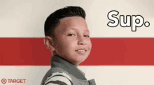 Young boy in a Target ad, standing in front of a red and white striped wall with 'Sup.' text.