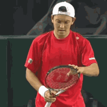 Tatsuma Ito, a tennis player in a red shirt and white cap, holds his racket and touches his shoulder on court.