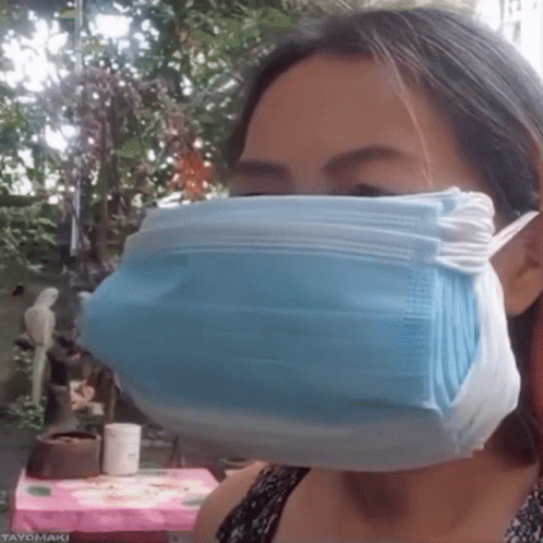 A woman wears an exaggerated number of blue surgical masks, creating a humorous take on COVID-19 protection.