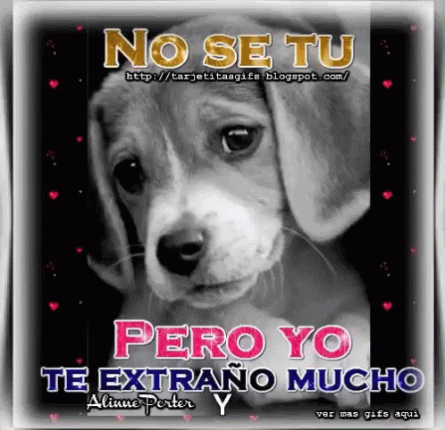 A sad puppy with animated text overlays in Spanish, conveying the message "I miss you very much."