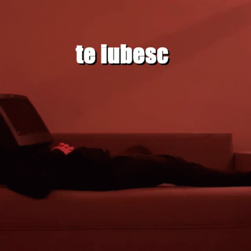 Person with a TV head lies on a couch as the text 'te iubesc' appears.