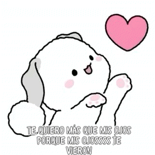 An adorable animated white dog-like character with blush covers its mouth, expressing deep affection with a Spanish phrase.