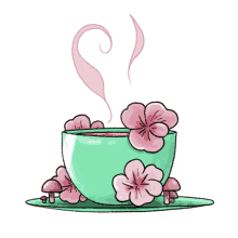 An enchanting illustration of a teal tea cup adorned with pink flowers and small mushrooms, inspired by Critical Role.