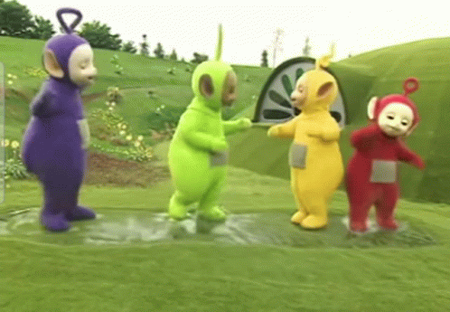 The Teletubbies, Tinky Winky, Dipsy, Laa-Laa, and Po, joyfully splash and play in puddles on a grassy field.