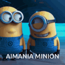 Two cheerful Minions from Despicable Me stand side-by-side, with the text 'AIMANIA MINION' displayed.