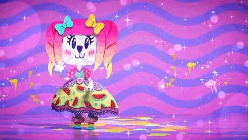 Animated character Teri from The Amazing World of Gumball dancing happily with rainbows and clouds.