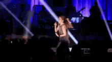 Thalia delivers a powerful live performance on stage, singing into a microphone for a captivated audience.