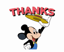 Mickey Mouse tips his hat, expressing gratitude with the word 'THANKS' displayed above him.