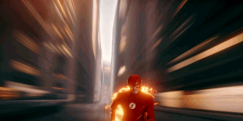 Grant Gustin as The Flash, running at super speed through a city street with lightning effects.
