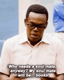 A character from The Good Place, wearing glasses, declares that his soul mate will be books.