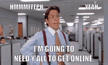 Bill Lumbergh from Office Space says 'I'm going to need y'all to get online' in this classic meme.