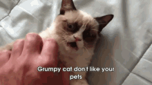 Grumpy Cat (Tardar Sauce) looking annoyed while being petted on a bed, with the caption 'Grumpy cat don't like your pets'.