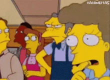 Mrs. Lovejoy from The Simpsons reacts with shock and distress, eyes wide and hands clenched.