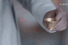 Close-up of a person holding a golden cup with intricate Chinese writing, from The Untamed series.