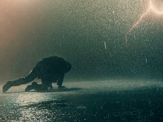 The Weeknd kneels in heavy rain, a silhouette against a dramatic bright light, evoking a sad and intense mood.