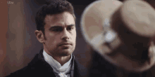 Theo James as Sydney Parker, looking intently in a period drama scene from Sanditon.