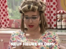 Therese Paré in curlers and glasses reacts to the late hour, exclaiming 'Neuf Heure Et Demi' in her kitchen.